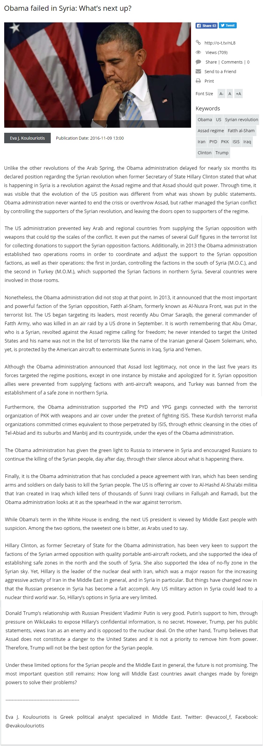 Obama failed in Syria: What’s next up?November 9, 2016 in Articles / Orient News tagged CLINTON / FATTH AL-SHAM / IRAQ / ISIS / JFS / OBAMA / PKK / PUTIN / PYD / RUSSIA / SYRIA / SYRIAN CRISIS / SYRIAN OPPOSITION / SYRIAN REVOLUTION / TRUMP / TURKEY / USA / YPG Link